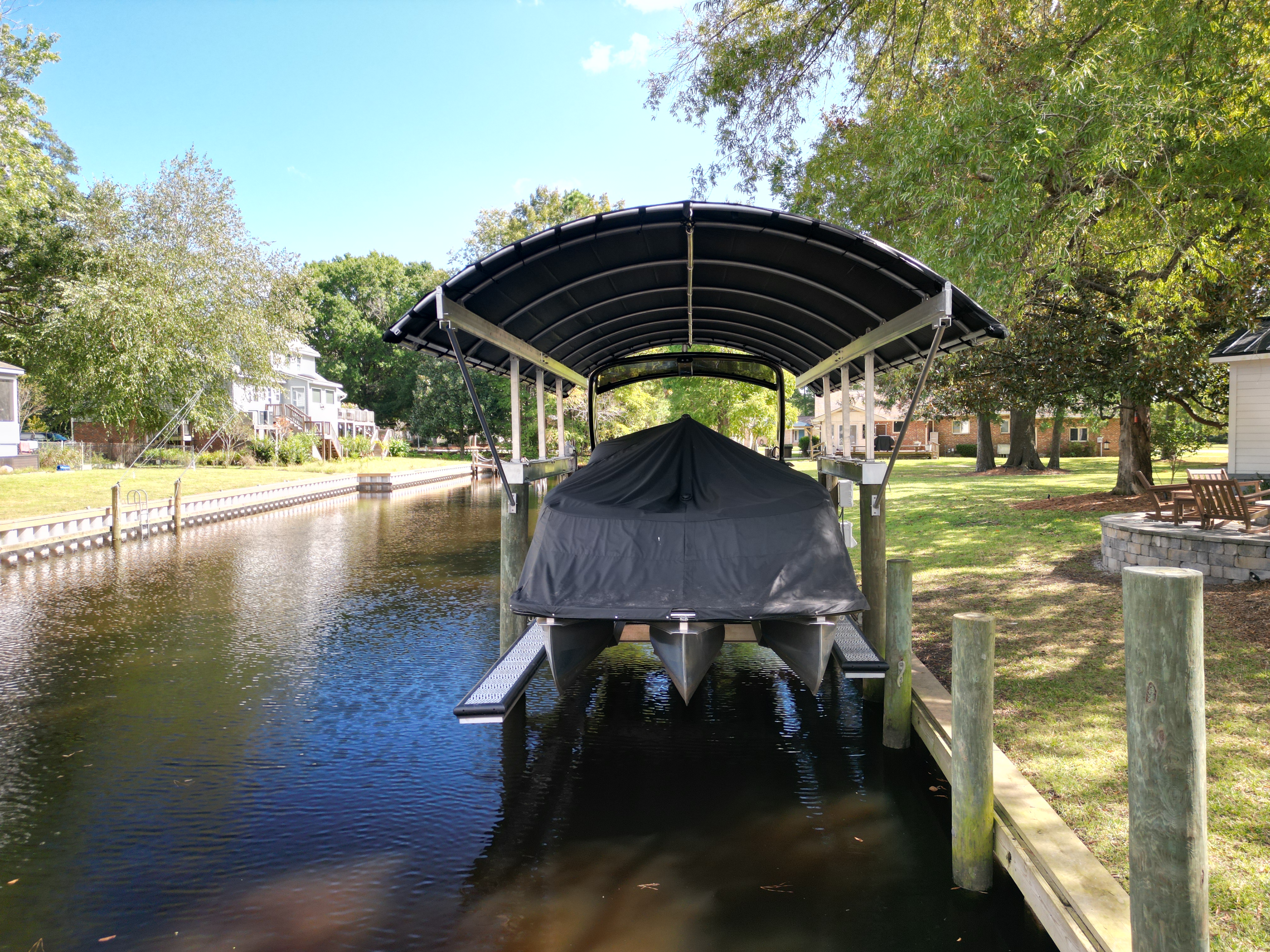 Our 13 oz architectural-grade vinyl cover resists mold, mildew, and UV breakdown — keeping your lift and watercraft protected season after season. Combined with a sleek, corrosion-resistant aluminum frame, it’s a system that looks sharp and lasts long.